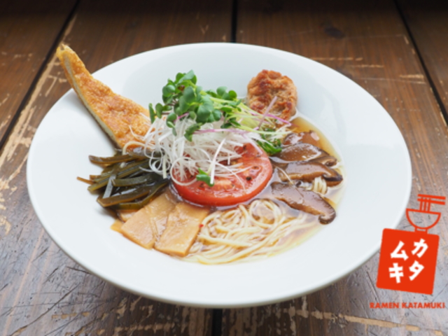 動物性食材を一切使用せず、昆布・干し椎茸・野菜などのうまみ成分を水からじっくりと抽出した、醤油味ベースのラーメンです。