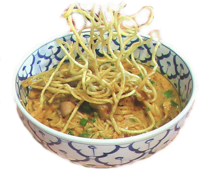 | カオソーイ "KAO SOHY" ココナッツカレーラーメン 「別名チェンマイヌードルともいわれるこの料理はチェンマイ地方の 名物ラーメンです。このまろやかな味わいにハマる方続出」 |