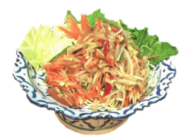 | ソムタム・パラー "SOM TAM PRARAA" 青パパイヤのスパイシーサラダ Spicy Papaya Salad (パラー味) (Pickled Fish Taste) 「タイ東北地方、ラオスの名物料理、地方のほうではパラーという 魚を発酵させた調味料を使います。 タイ上級者向けの味付けです」 |